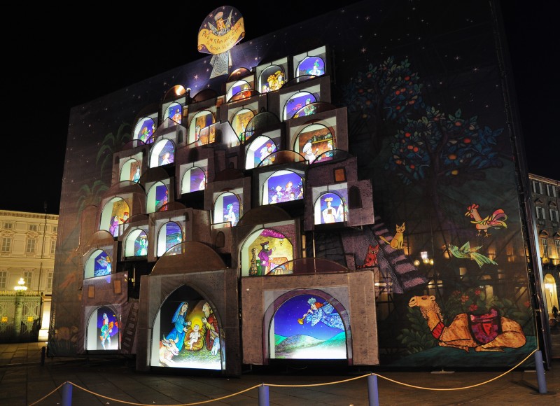 Advent calendar set up in San Carlo Square in Turin, realising by the Regio Theatre of Turin thanks to the paintings of Lastrego&Testa, that were based on Emanuele Luzzati’s sketch (the famous illustrator and set designer who realised the magic Nativity in the Medieval district). Piedmont, Italy.