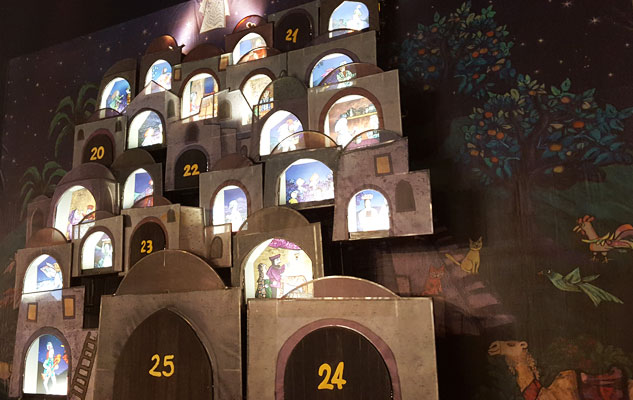 Calendario dell’Avvento in Piazza San Carlo, Torino, opera realizzata dal Teatro Regio di Torino grazie ai disegni di Lastrego&Testa sui bozzetti del grande illustratore e scenografo Emanuele Luzzati, di cui Torino ospita anche il magico Presepe al Borgo Medievale.