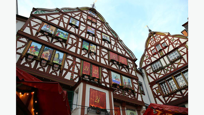 A nice detail of the giant Advent calendar of the famous Christmas Market of Bernkastel-Kues, Rhineland-Palatinate, Germany (Moselle allemande Bernkastel Kues calendrier de l’avent, Jean-Claude Haelterman)