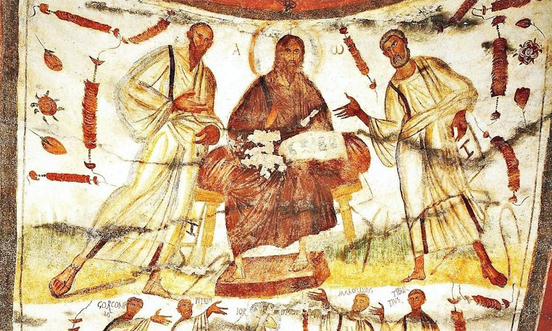 - Dettaglio di un affesco rappresentante San Pietro che regge un cartiglio: Figure no. 93 published in Wilpert, J. Die Malereien der Katacomben Roms; Herder: Freiburg im Breisgau, Germany, 1903. [Google Scholar] pubblicata anche nell’articolo: De Caro, L.; La Greca, F.; Matricciani, E. The Search of St. Peter’s Memory ad catacumbas in the Cemeterial Area ad Duos Lauros in Rome. Heritage 2021, 4, 479-506.