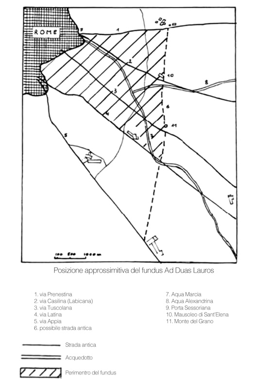 Ci troviamo nel Complesso Archeologico ad Duas Lauros, al terzo miglio di Via Labicana, vincolato come area di importanza archeologica dal Decreto Ministeriale il 16 aprile 1987 ai sensi della legge 1098 dell’1 giugno 1939. Un complesso che sorge nel cosidetto Fundus Laurentum (o Laurentus), un possedimento imperiale di proprietà di Elena (la madre dell’Imperatore Costantino) che si estendeva dalla Porta Sessoriana (l’attuale Porta Maggiore) fino al Mons Gabus (il mausoleo detto “Monte del Grano”, presso Piazza dei Tribuni); compresa tra le vie Prenestina e Latina.