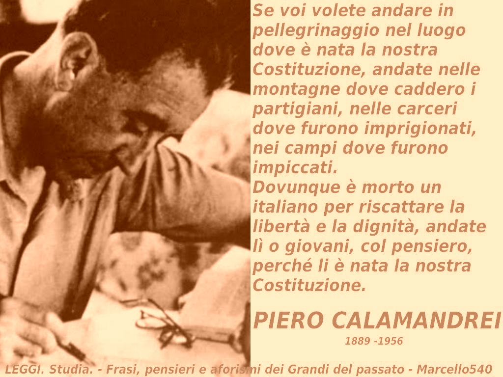 E quando io leggo nell’art. 2: «l’adempimento dei doveri inderogabili di solidarietà politica, economica, sociale»; o quando leggo nell’art. 11: «L’Italia ripudia le guerre come strumento di offesa alla libertà degli altri popoli», la patria italiana in mezzo alle altre patrie… ma questo è Mazzini! questa è la voce di Mazzini! O quando io leggo nell’art. 8: «Tutte le confessioni religiose sono egualmente libere davanti alla legge», ma questo è Cavour! O quando io leggo nell’art. 5: «La Repubblica una e indivisibile, riconosce e promuove le autonomie locali», ma questo è Cattaneo! O quando nell’art. 52 io leggo a proposito delle forze armate: «l’ordinamento delle forze armate si informa allo spirito democratico della Repubblica», esercito di popoli, ma questo è Garibaldi! E quando leggo nell’art. 27: «Non è ammessa la pena di morte», ma questo è Beccaria! Grandi voci lontane, grandi nomi lontani… Ma ci sono anche umili nomi, voci recenti! Quanto sangue, quanto dolore per arrivare a questa costituzione! Dietro ogni articolo di questa Costituzione, o giovani, voi dovete vedere giovani come voi caduti combattendo, fucilati, impiccati, torturati, morti di fame nei campi di concentramento, morti in Russia, morti in Africa, morti per le strade di Milano, per le strade di Firenze, che hanno dato la vita perché libertà e la giustizia potessero essere scritte su questa carta. Quindi, quando vi ho detto che questa è una carta morta, no, non è una carta morta, è un testamento, è un testamento di centomila morti.